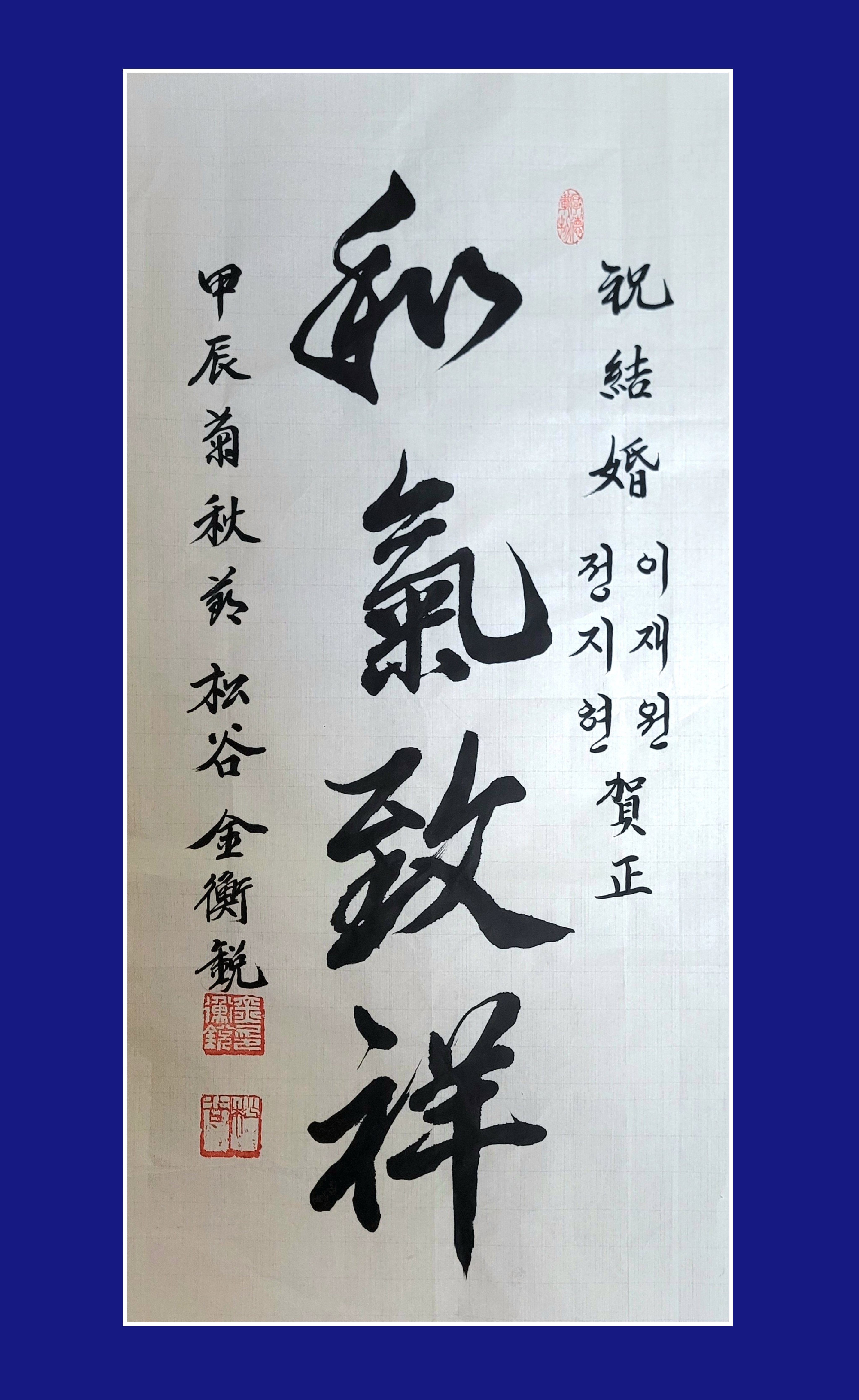 인생의 새출발을 하는 신랑 신부을 축하하며 붓을 잡다.